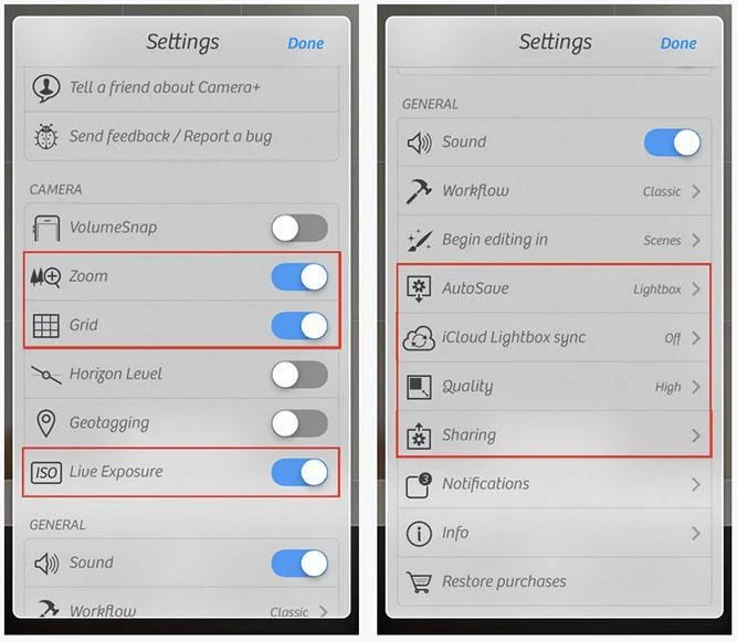 - همگامسازی iCloud با Camera+: کسانی که از برنامه iPhone Camera+ استفاده میکنند، میتوانند کار همگامسازی iCloud و پوشه ذخیره تصاویر LightBox را انجام دهند و بدین ترتیب، تمام تصاویر گرفته شده به صورت مستقیم در فضای iCloud ذخیره خواهند شد.