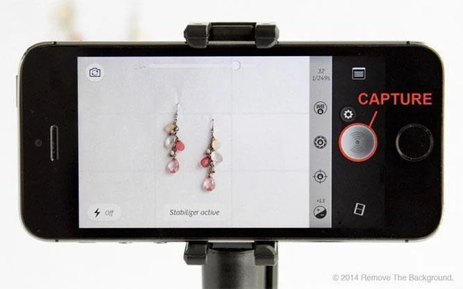 گوشی هوشمند خود را در مکانی که محصول موردنظرتان به طور کامل در کادر قرار گیرد، تثبیت کرده تا بتوانید تصویر باکیفیتی از آن تهیه کنید. در تصویر مقابل مشاهده میکنید که به علت کوچک بودن سایز گوشوارهها، گوشی هوشمند را به وسیله سه پایه در فاصله نزدیک به محصول قرار دادهایم تا بتوانیم تصویر باکیفیتی ثبت کنیم، همچنین با استفاده از لنز تله فوتو Photojojo سعی کردیم تا حد نیاز به محصول نزدیک شویم.