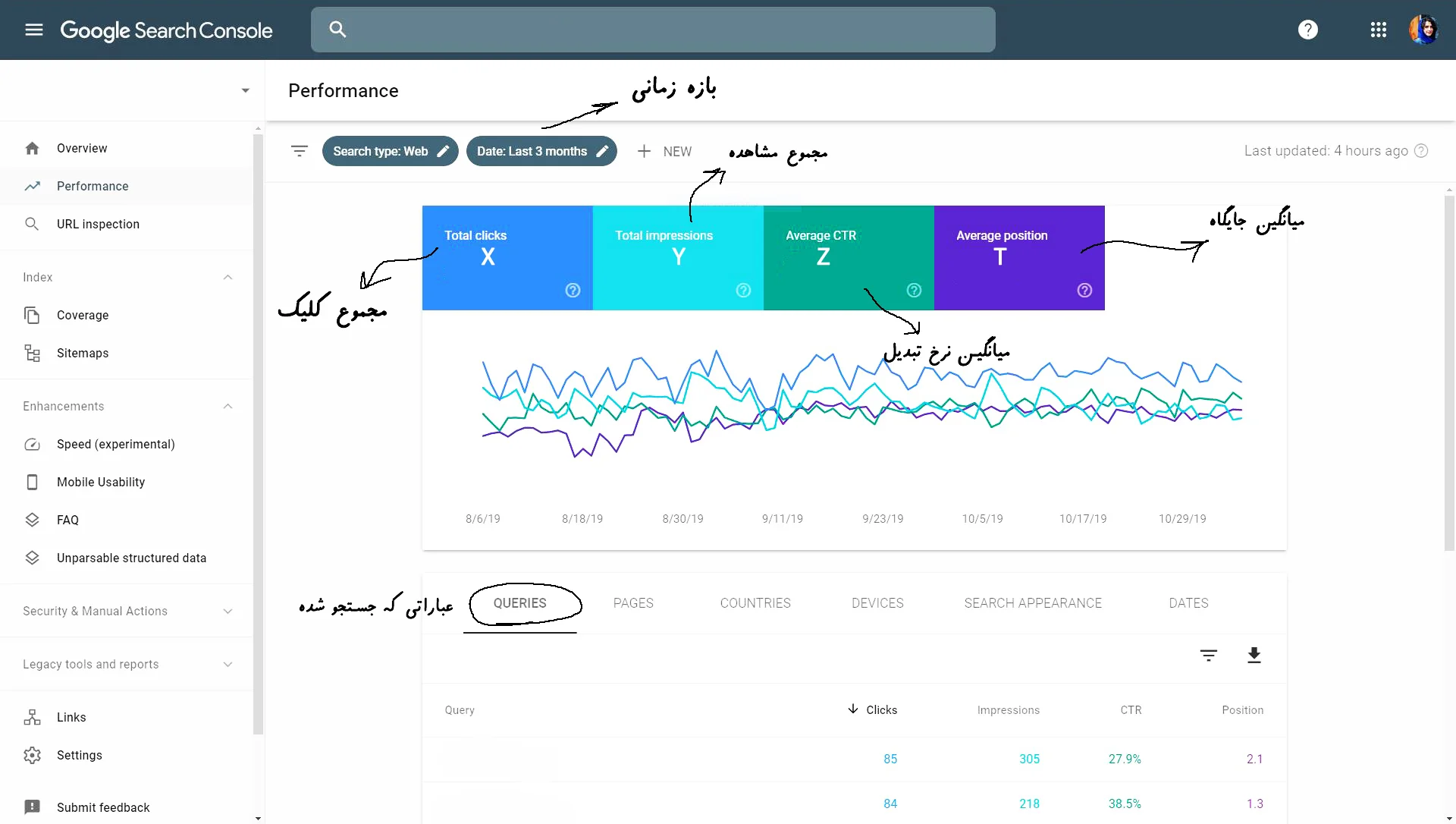 - میانگین جایگاه (position): میانگین جایگاه شما در نتایج جستجوی کلمات و عبارات را نشان میدهد.