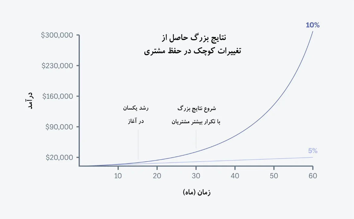 به عنوان مثال، در نمودار زیر، هر فروشگاه 100 مشتری داردکه هر ماه یک قلم کالای 10 دلاری می خرند. فروشگاهی که بارنگ بنفش روشن نشان داده شده، 5% از مشتریان هر ماه را حفظ می کند و فاین نرخ برای فروشگاه با رنگ بنفش تیره، 10% است. همانطور که می بینید، 5% جلو بودن در حفظ مشتری، موجب رشد سریعی می شود که کسب آن تنها با جذب مشتری، مشکل خواهد بود.