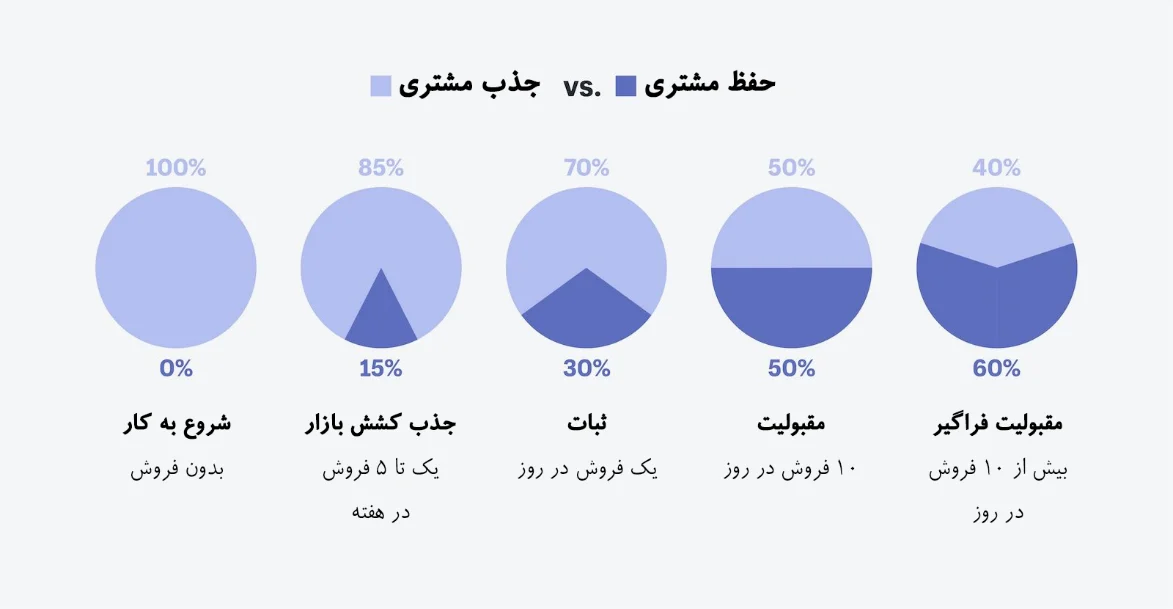 - شروع به کار: وقتی که تازه فروشگاه خود را راه اندازی کرده اید، باید روی جذب مشتریان تمرکز کنید. در این مرحله باید به مراحل قبل از حفظ مشتری فکر کنید و روی استراتژیها و تاکتیکهایی تمرکز کنید که به رشد پایه مشتریان شما کمک می کند.