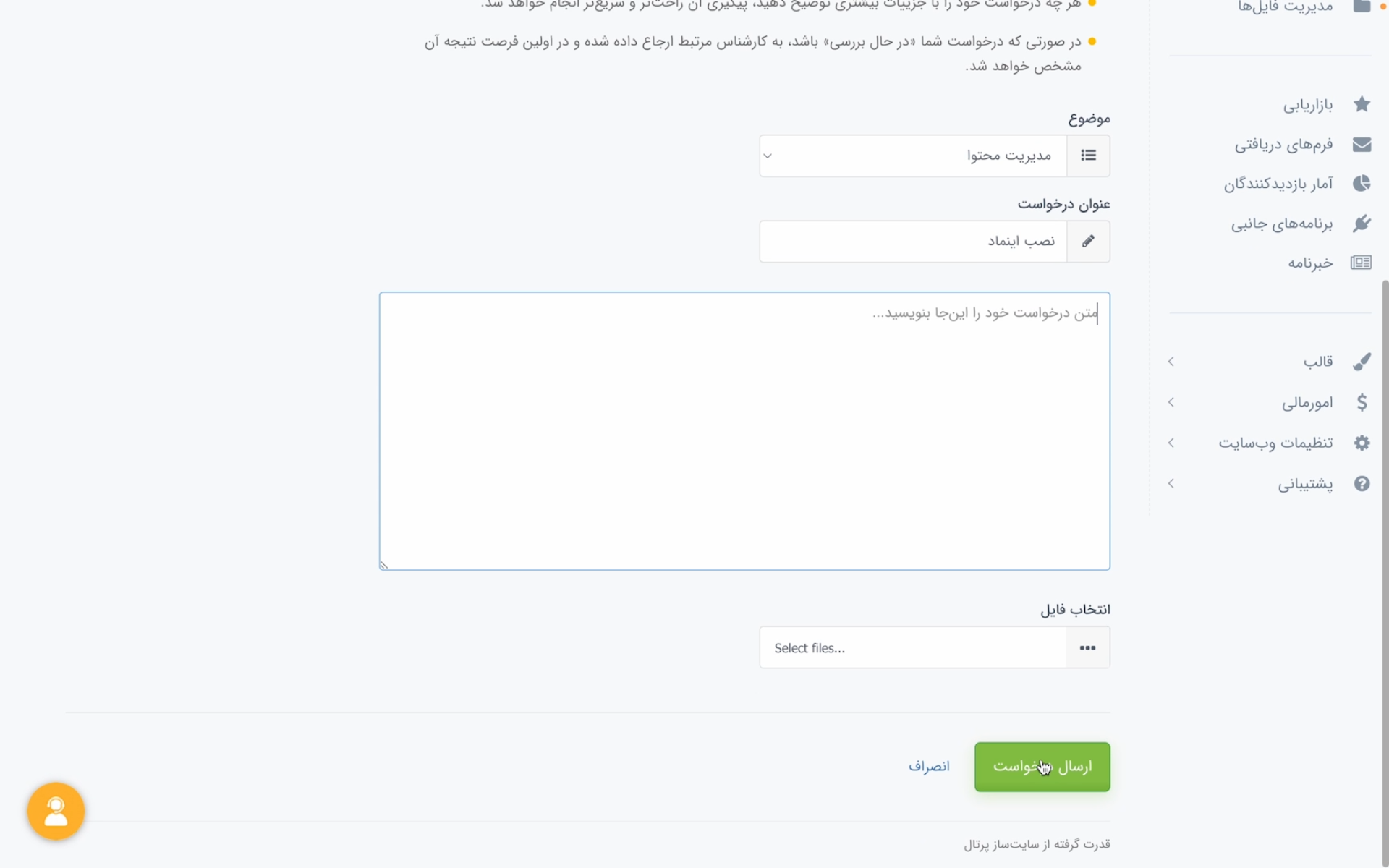 با این کار وارد صفحه ارسال تیکت پشتیبانی به پرتال میشوید. از این صفحه یک تیکت برای پشتیبانی بفرستید تا در کمترین زمان ممکن کد اینماد شما را به سایتتان اضافه کنند.
