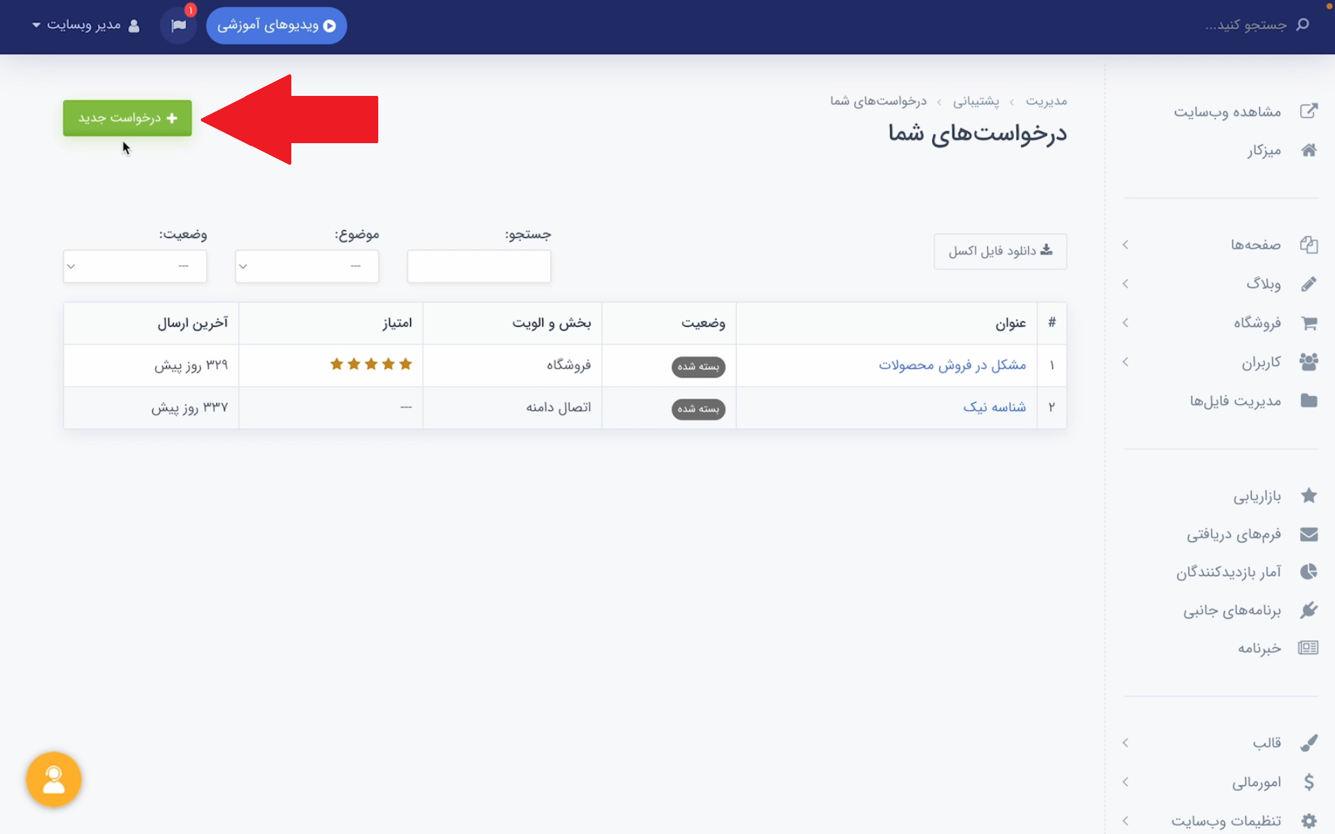 در ادامه وارد صفحههای تیکتها میشوید. در این صفحه روی دکمه «درخواست جدید» کلیک کنید.