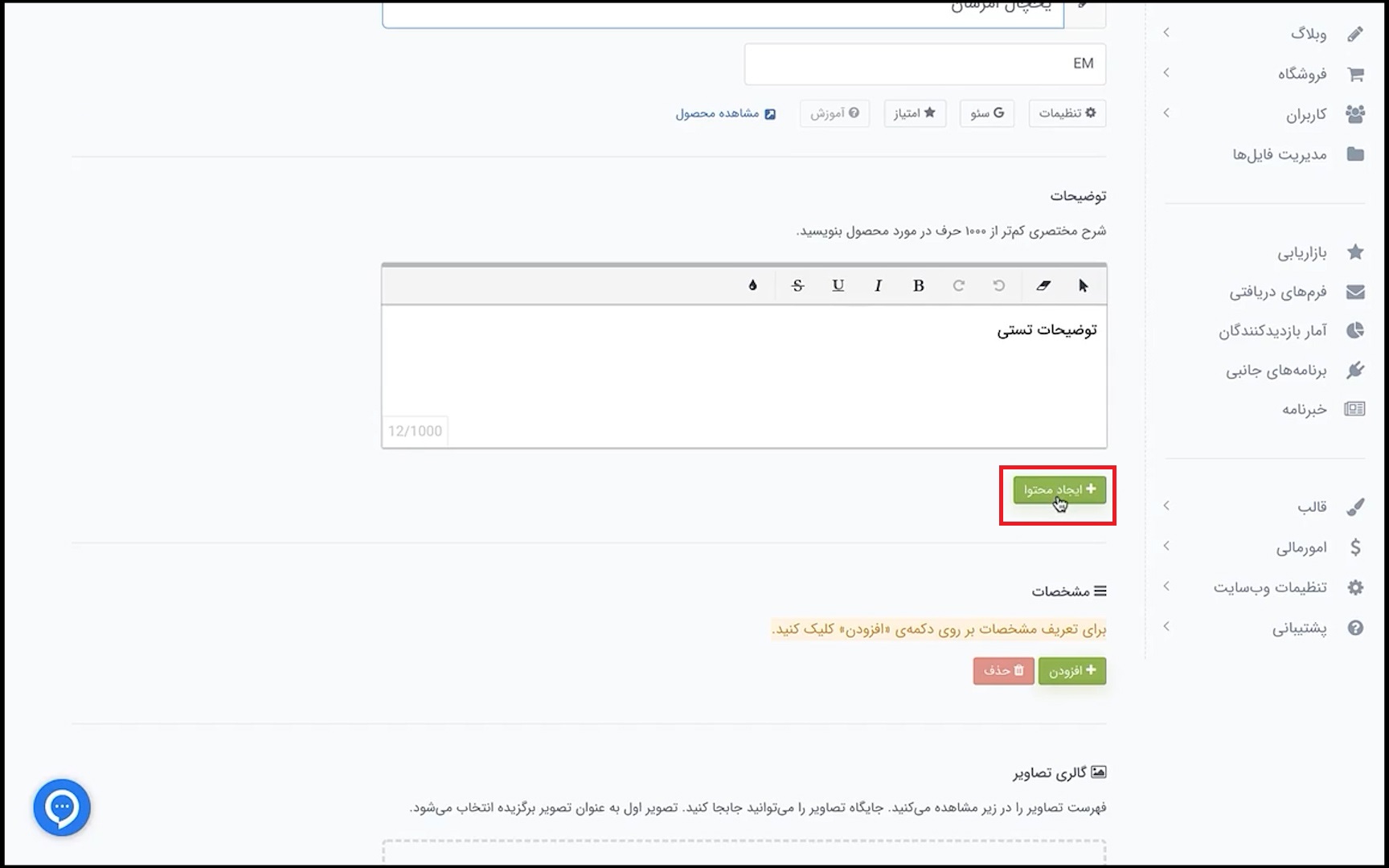 در بخش توضیحات محصول روی دکمه سبز رنگ «ایجاد محتوا» کلیک کنید تا یک قسمت جدید برای قرار دادن ویدیو ایجاد شود.