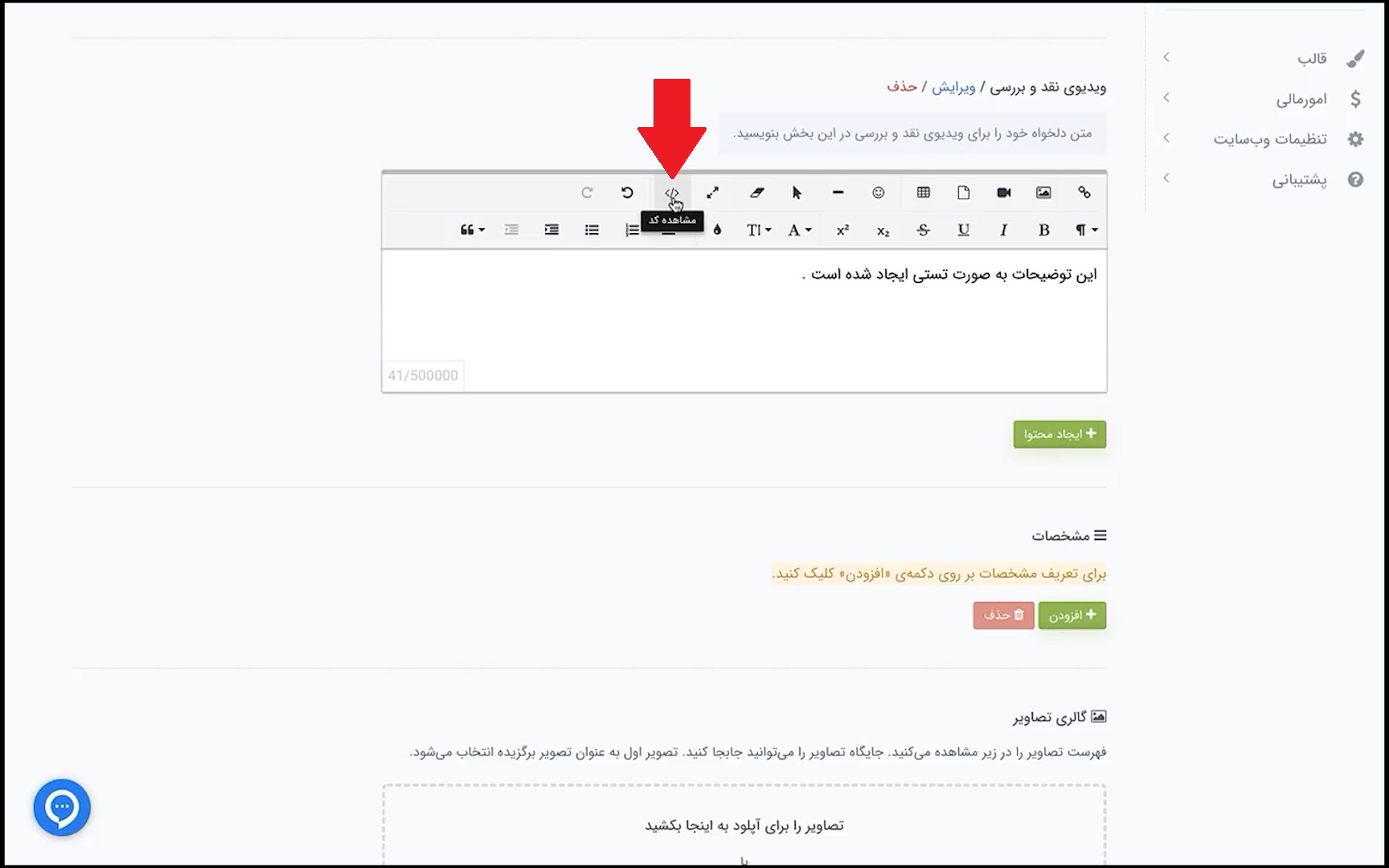 دوباره به سایت و قسمتی که در مراحل قبلی ایجاد کرده بودید، برگردید. حالا از نوار بالای بخش توضیحات، روی آیکون مشاهده کد که در عکس مشخص شده است کلیک کنید.