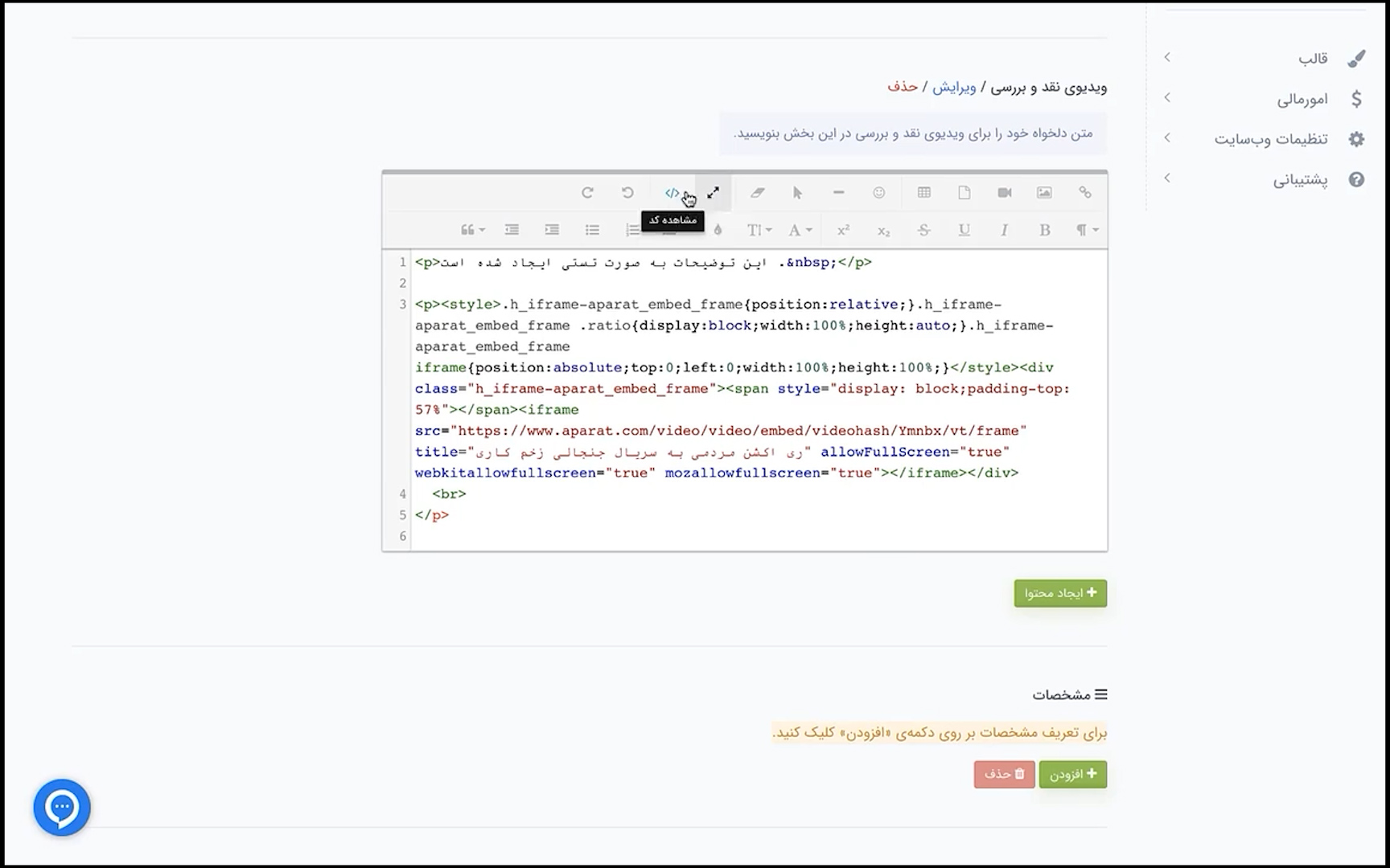 در ادامه کدی که از آپارات کپی کرده بودید را داخل این قسمت قرار دهید و دوباره دکمه «مشاهده کد» را بزنید تا دوباره به حالت اول برگردد.