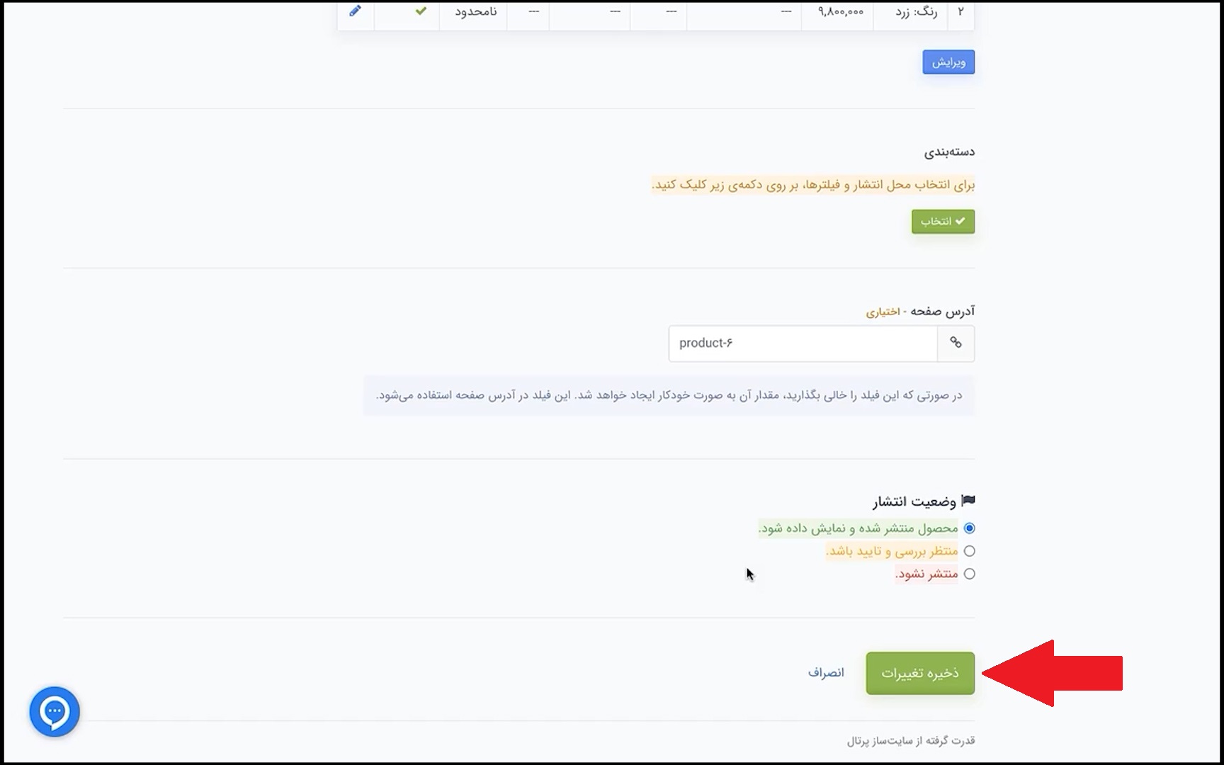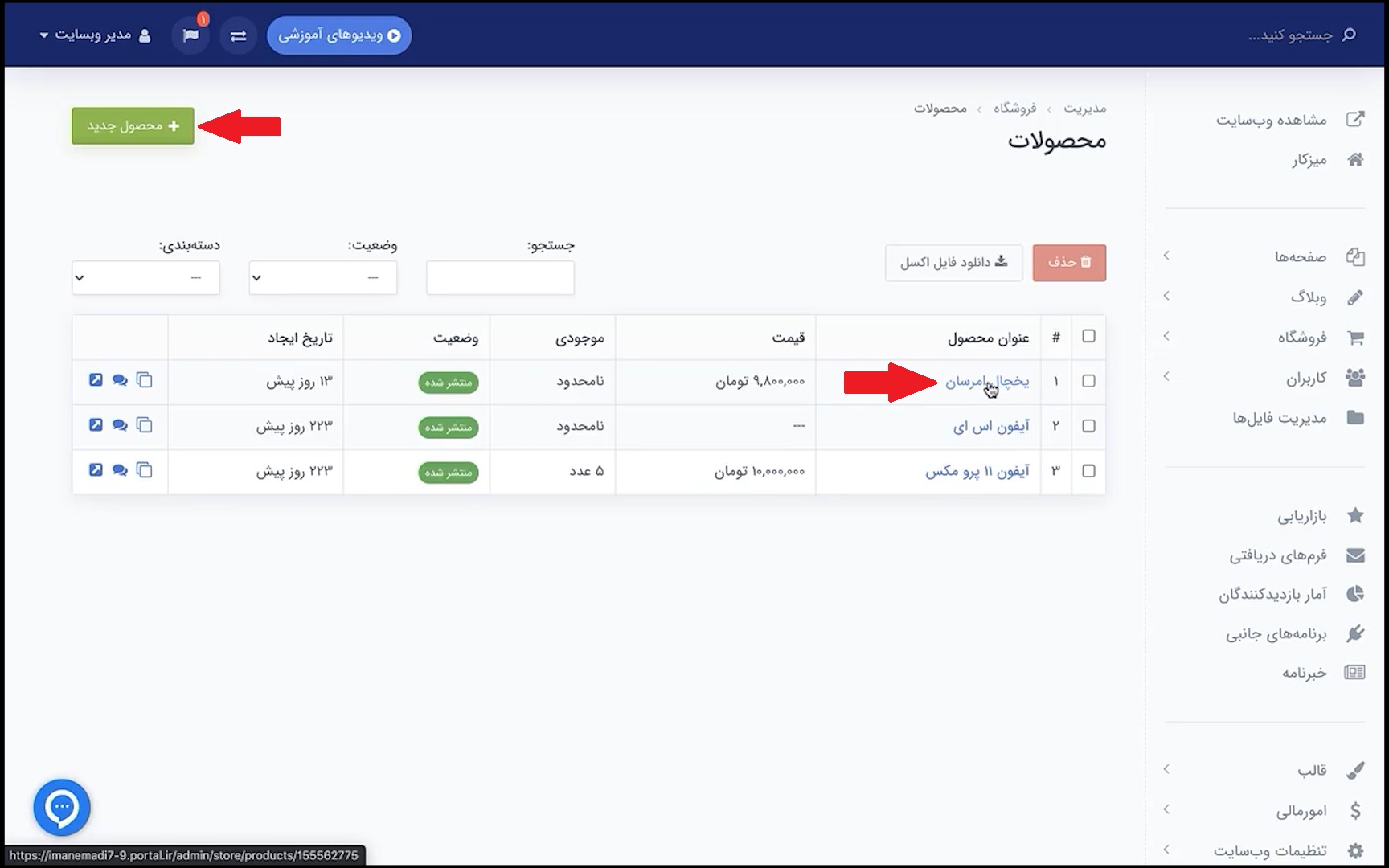 برای قرار دادن ویدیو از طریق آپارات، اول از همه وارد پنل مدیریت سایتتان شوید و به قسمت ویرایش صفحهای که میخواهید ویدیو در آن نمایش داده شود بروید. به عنوان مثال ما الان میخواهیم ویدیویی را داخل صفحه یکی از محصولات قرار دهیم. برای صفحات دیگر سایت هم روش کار به همین صورت است و هیچ تفاوتی ندارد. ابتدا از منوی سمت راست پنل مدیریت روی گزینه «فروشگاه» کلیک کرده و بعد گزینه «محصولات» را بزنید. به این ترتیب لیستی از محصولات سایتتان به شما نمایش داده میشود. اگر محصول موردنظرتان را از قبل وارد کردید، از لیست ممحصولات آن را پیدا کرده و روی اسم آن کلیک کنید. اگر هم محصول را هنوز را ایجاد نکردهاید، دکمه سبز رنگ محصول جدید در بالا سمت چپ صفحه را بزنید و آن محصول را داخل سایت تعریف کنید.