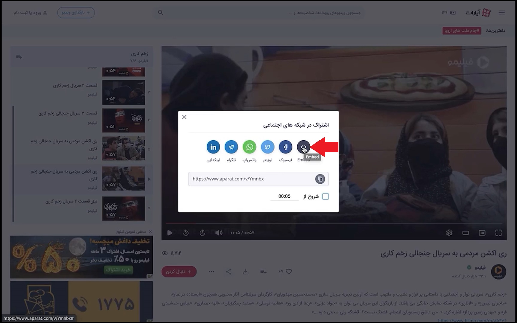 حالا به سایت آپارات بروید و ویدیو خودتان را داخل آپارات آپلود کنید. در صفحه پخش ویدیو در آپارات روی گزینه «اشتراک گذاری» مثل عکس زیر کلیک کنید.