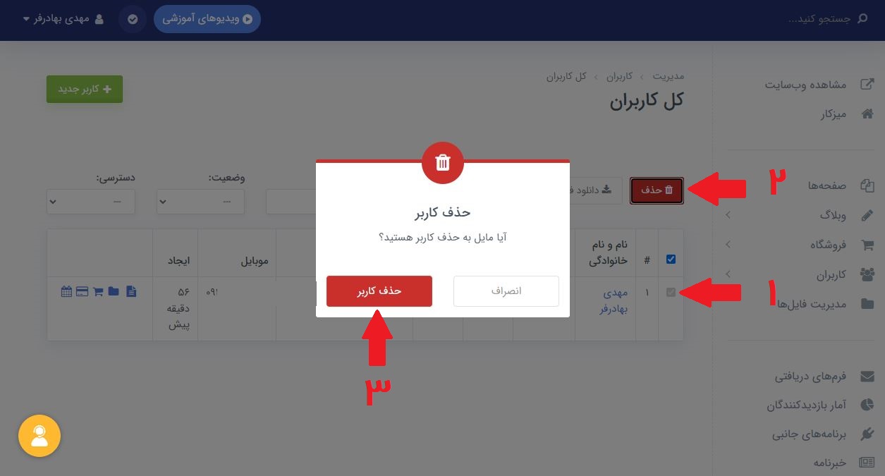 برای حذف کاربران ابتدا تیک کنار هر کدام از کاربران که میخواهید حذف شوند را بزنید. سپس از بالای صفحه روی دکمۀ قرمز رنگ "حذف" کلیک کنید. در پنجرهای که برای شما باز میشود، روی دکمۀ حذف کاربر کلیک کنید تا آن کاربر از سایت شما حذف شود.