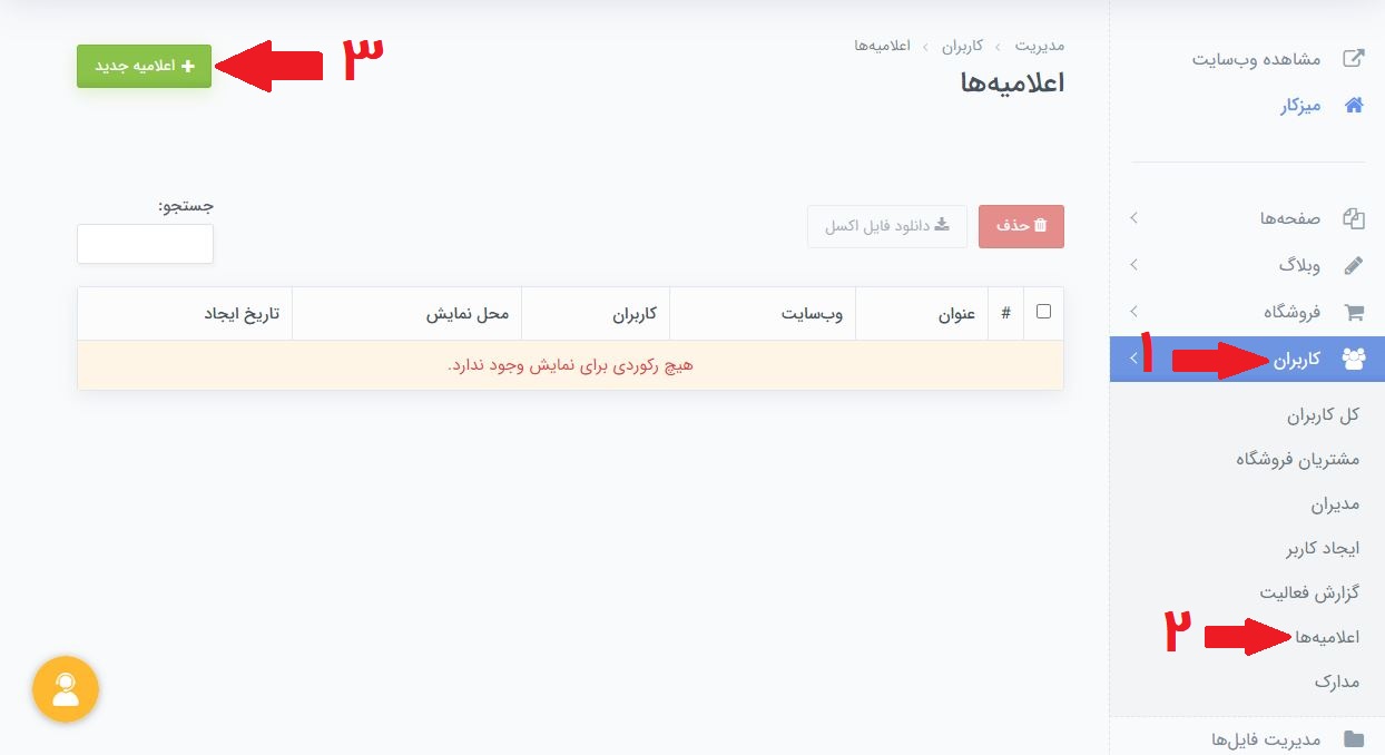 اعلامیهها متن کوتاهی هستند که میتوانید آنها را در پنل کاربری و پنل مدیریت سایتتان نمایش دهید. این اعلامیهها میتوانند بهصورت هشدار، اطلاعات، اخطار و موفقیت انجام کاری باشند که در 4 رنگ متفاوت در بالای پنلهای کاربری و مدیریت نمایش داده میشوند. شما میتوانید اعلامیهها را طوری تنظیم کنید که در تمام بخشهای پنل کاربری و مدیریت نمایش داده شوند یا اینکه فقط در بخش خاصی از پنل باشند. برای تنظیم اعلامیه میتوانید به روش زیر اقدام کنید: