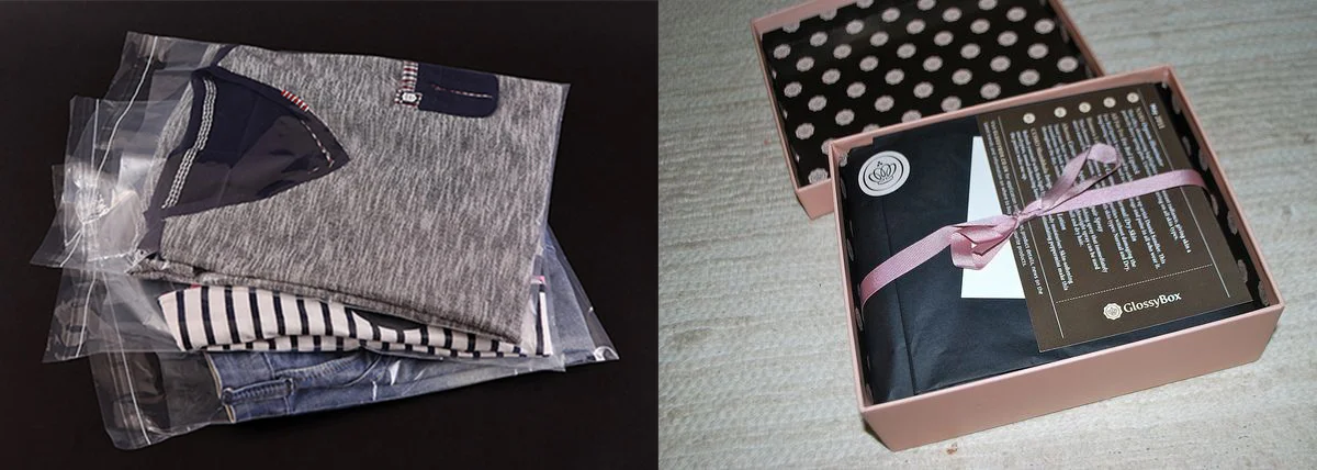 بگذارید این موضوع را با یک مثال توضیح دهم. در عکس زیر دو نمونه بستهبندی از فروشگاههای اینترنتی لباس و پوشاک را میبینید. اگر شما بخواهید یکی از این دو فروشگاه را برای خرید انتخاب کنید کدامیک را ترجیح میدهید؟