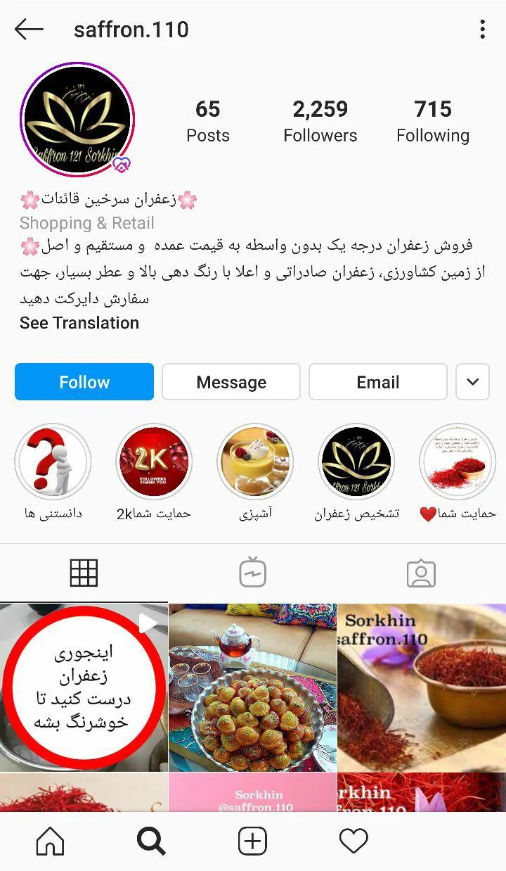 یکی از نمونه پیجهایی که نسبتا خوب کار کرده است، فروشگاه زعفران سرخین قائنات است. یکی از مهمترین نکات مثبت این پیج، محتوای آن است. مثلا زعفران چه خواصی دارد، چه غذاها و خوراکیهایی میتوان با زعفران درست کرد؛ چگونه زعفران اصل را تشخیص دهیم و محتوای دیگری که برای افراد جالب است.