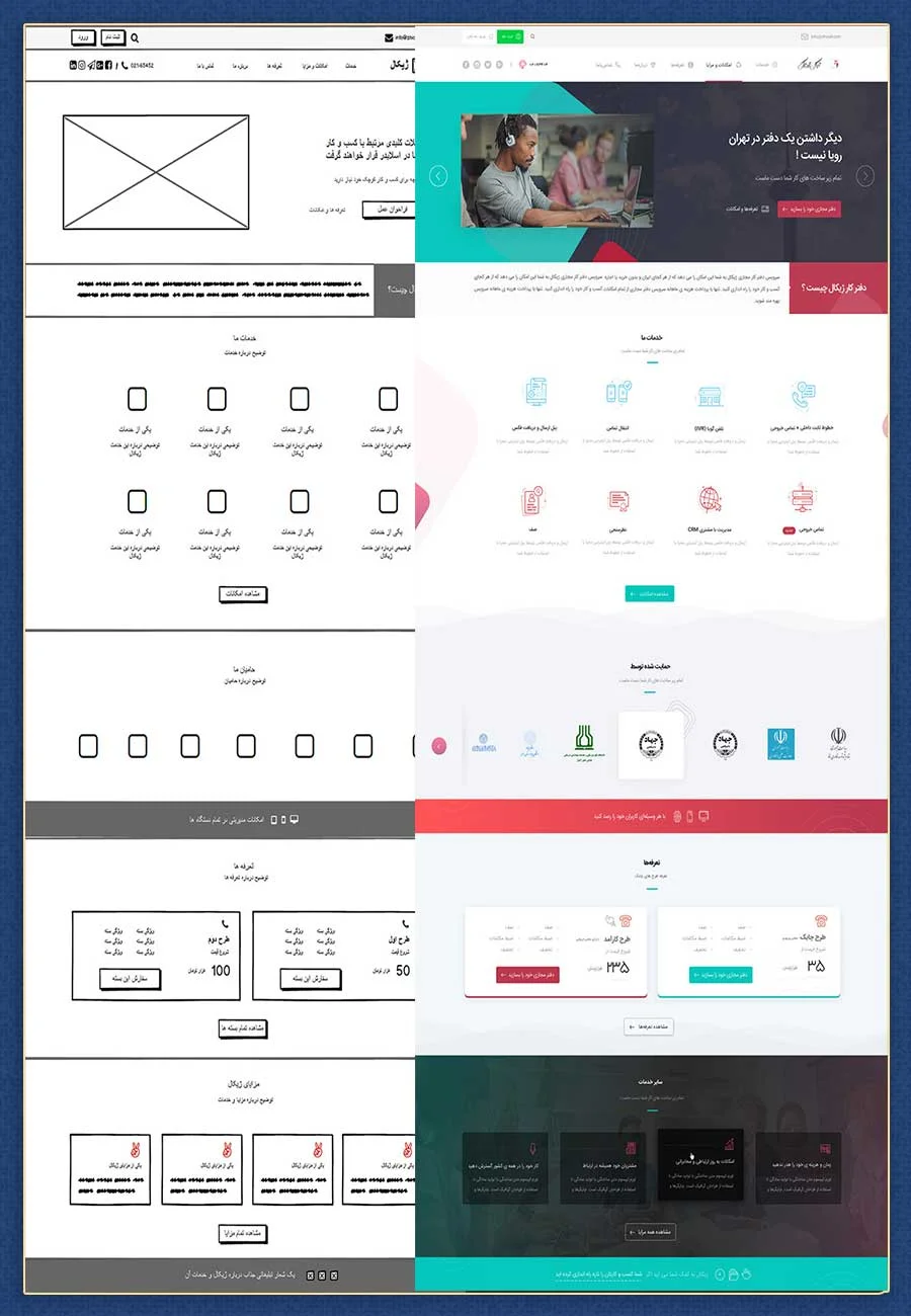 "تصویر سمت چپ طرح وایرفریم و تصویر سمت راست طرح PSD و یا گرافیکی وب سایت میباشد که به صورت اختصاصی و بر اساس نیاز کاربر طراحی شده است."